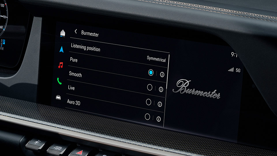 The Burmester High-End Surround Sound System unleashes its full dynamic potential of 915 watts in the 911. The 13 individually driven speakers enable a top-class music experience.