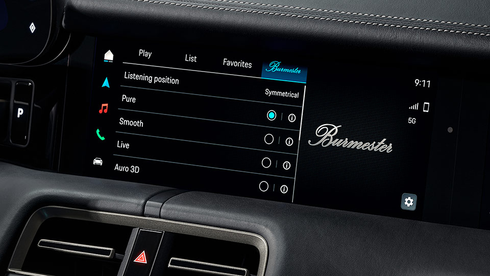 The Burmester 3D High-End Surround Sound System unleashes its full dynamic potential of 1,455 watts in the Taycan. With 21 high-performance speakers, it creates a three-dimensional soundscape thanks to Auro 3D®, living up to the claim of "concert hall on wheels" on every route.