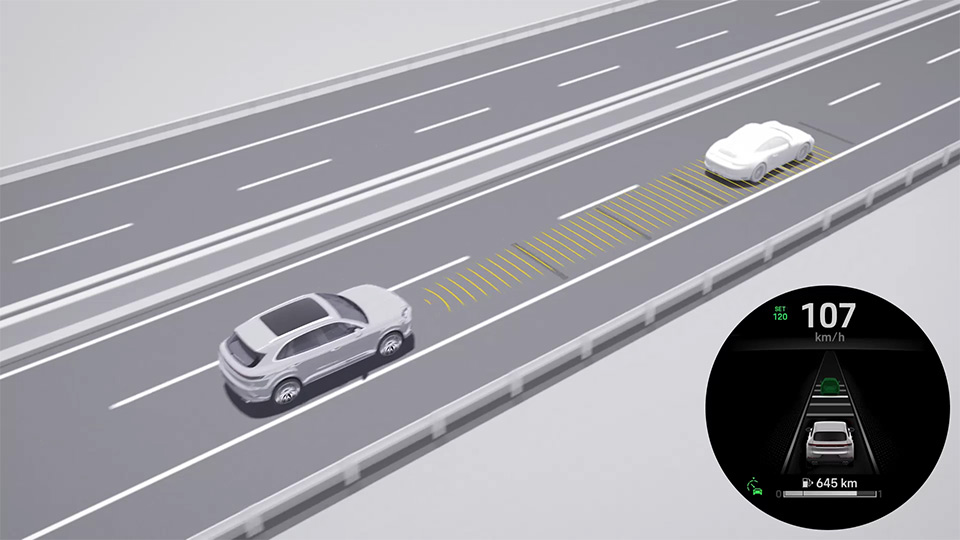 Radar- and video-based technology that monitors and automatically regulates the distance from the vehicle in front as required even down to a halt by means of the stop-and-go function (usable at 19+ mph). Additional functions: audible warning if too close; warning by active jolt of the brakes; strategic braking; visual and audible warning if pedestrians are detected within collision range.