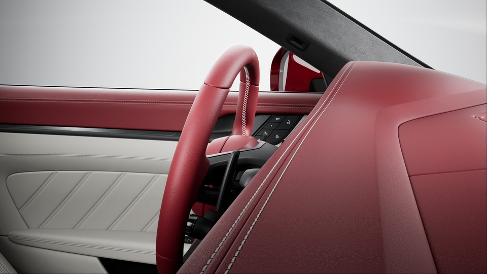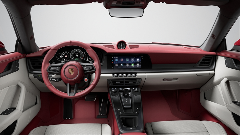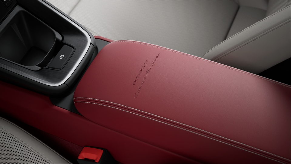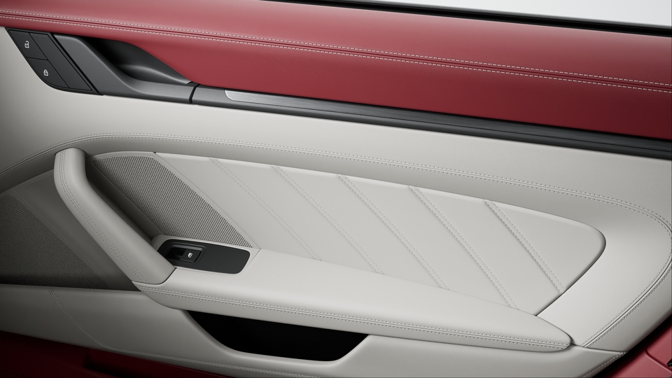 包括以下部件:930 真皮组件、真皮仪表板饰板组件 (仪表板端部饰件、包括护盖和 Sport Chrono 计时器在内的仪表板上部中央饰板)、真皮车门饰件组件 (车门拉手、门板下部饰件、后侧下部)、座椅头枕上的保时捷盾徽、储物箱盖上的“Porsche Exclusive Manufaktur”压花、杯座真皮饰件、Race-Tex 面料安全带出口饰件 (适用于 911 Carrera Coupé 车型)