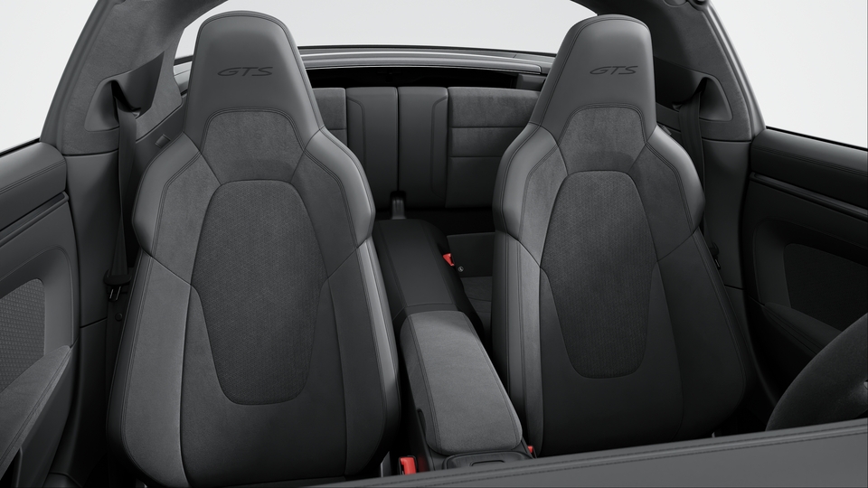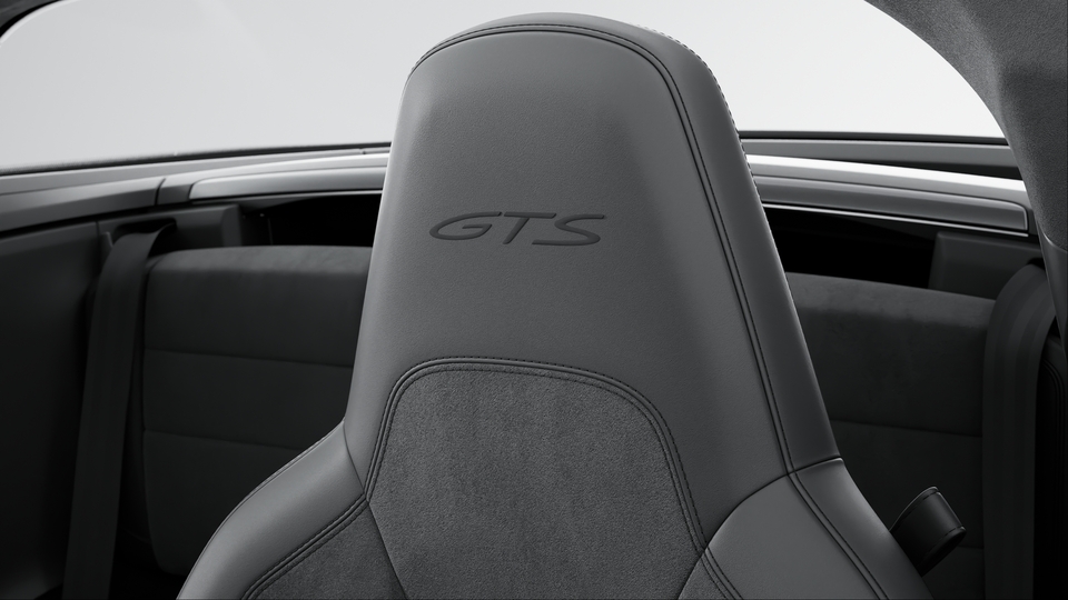 Race-Tex 面料:带纽结纹压花的前排和后排座椅中心、方向盘轮圈、门把手、门板扶手、包含手套箱盖的仪表板下部、储物箱盖 (部分)、带纽结纹压花的车门中心面板、杯座护盖和手动换档杆。座椅头枕上的黑色刺绣 “GTS” 标志